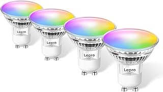 Specifications GU10, 4.5W, 220-240V AC Up to 300lm (White Light Mode) RGB + Warm White 2700K Dimmable via app or voice 100° Beam Angle ø50*55mm App: Lepro LampUX or Smart Life Alexa Skill: LE LampUX or Smart Life Remote control via free "Lepro LampUX" app. Compatible with Alexa and Google Home. No hub required, connect to 2.4GHz Wifi only. Lepro GU10 Smart Light Bulbs, RGB Color Changing LED Bulb, No Hub Required, 2.4G WiFi Only, Pack of 4 2 5 5 1. Light Color: RGBW Brightness (lm): 385 Base Type: GU10 Protection Rating: IP20 Package Quantity: Pack of 4 Units Color Temperature (K): 2700-6500K Power Consumption (W): 4.5 Safety Rating: FCC Input Voltage: 120V AC. FREE 1-5 Days